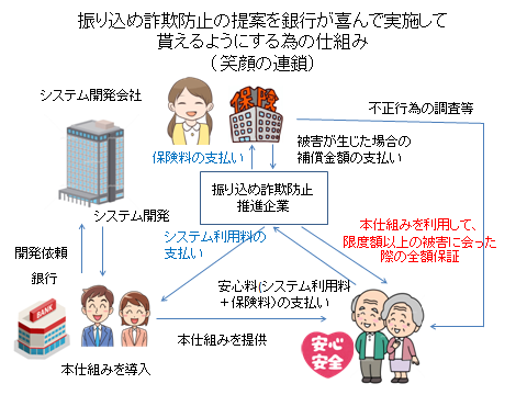 この仕組みの最大のポイントは、この仕組みを活用した人に対しては、保険会社と提携して、実際に本人が限度額(少額の出し入れの場合には、チェック代理人の承認を必要としないユーザが決めた上限金額)以上の被害が生じた場合は、被害額の全額保証することです。更に,この方法を推進することにより、銀行の収入に繋がることです。