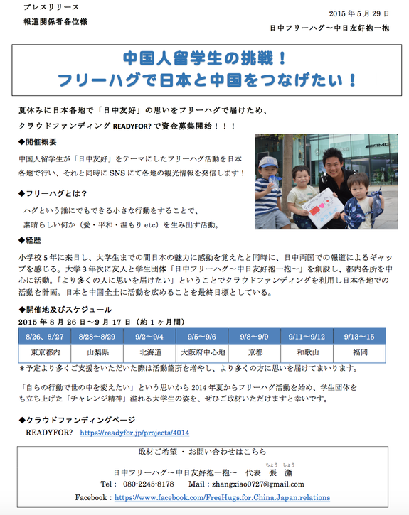 日中フリーハグハグ〜中日友好抱一抱〜代表の張です。