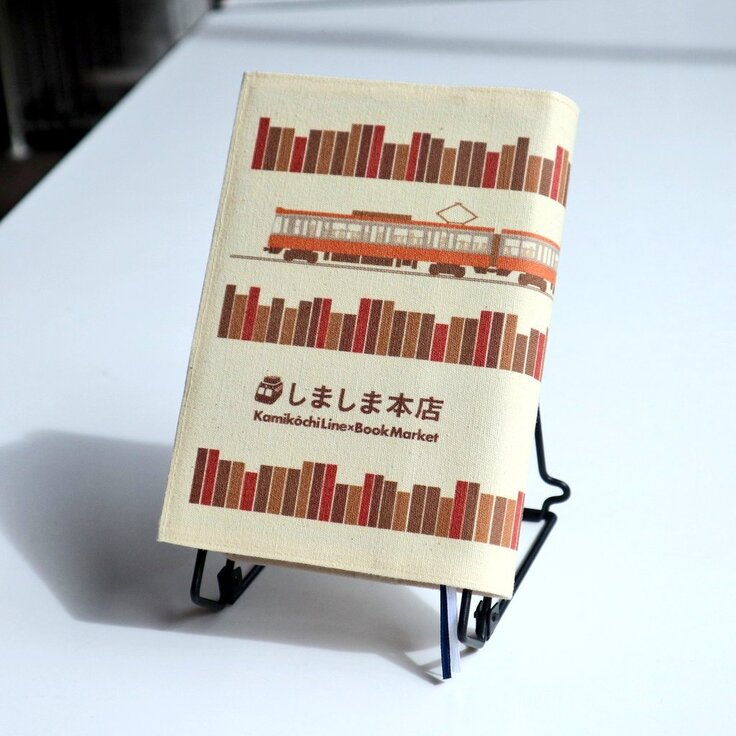今回のイベントに合わせた新規制作グッズです。しましま本店のテーマである「山ゆき電車に乗って 本とひとをめぐる小さな旅へ」をイメージしてデザインしました。布製(コットン生地)で文庫本(A6サイズ)に対応しています。