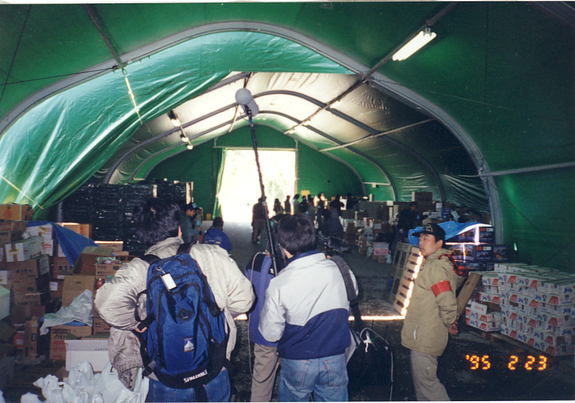 (阪神・淡路大震災で被災者への救援物資の仕分け作業中の配送センターと伊永。テレビで全国に紹介されました。)