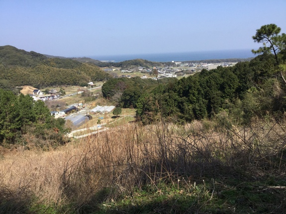 (スクールの会場となるほっこり農園の頂上からの全景、山と海と畑です。)