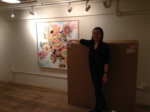 131×131×18cm の梱包された作品をカートに乗せると前が見えない。