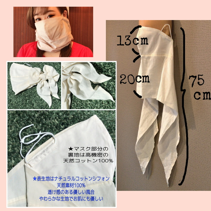 マスク部分の裏は高機密でお肌に優しい天然の綿素材になっており、ストールの部分は天然の綿シフォン生地を二重に、柔らかくアレンジしやすい仕様になっています。取り外し可能の耳かけ用ゴム紐(長さ調整可)がついています。