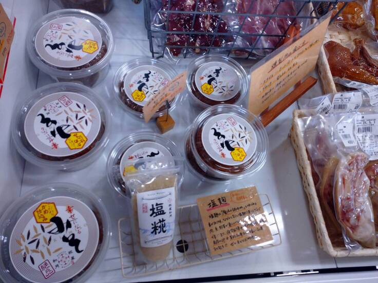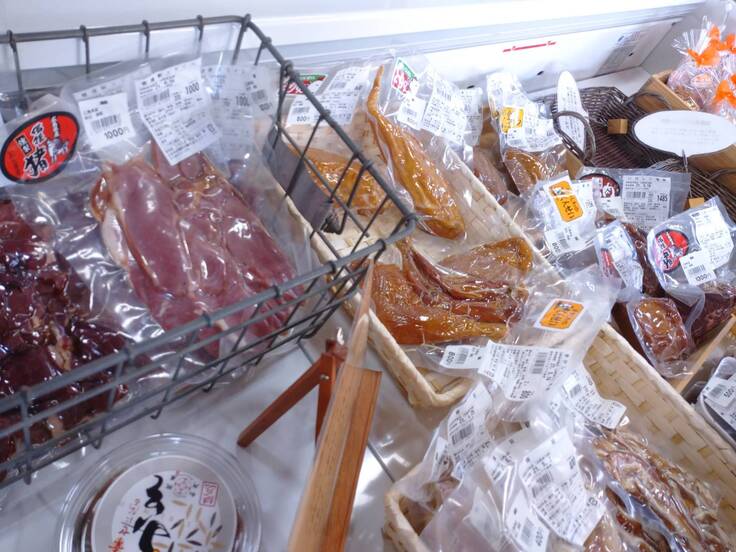 念願だった平型の冷蔵ショーケースには、今は地元のジビエの燻製や三原市内の鶏肉の燻製などと手作りの味噌や糀を置いていますが、手に取りやすくなったため売り上げがぐんと伸びてきています。