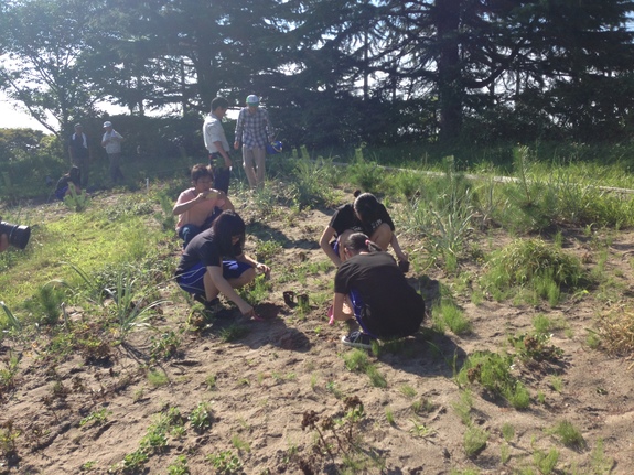 太陽が徐々に高くなり、じりじりと射す日光を感じながら、ハマヒルガオ、ハマニガナ、ハマボウフウ、ウンランを各5株づつ植えて、仮設のお母さん方が作ってくれた朝ごはんを美味しくいただきました。