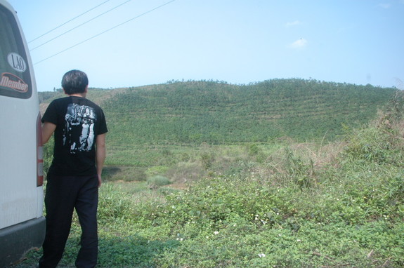 (メコン川沿いの集落の山一面に植えられたゴムの木/2009年ラオス/撮影:上垣)