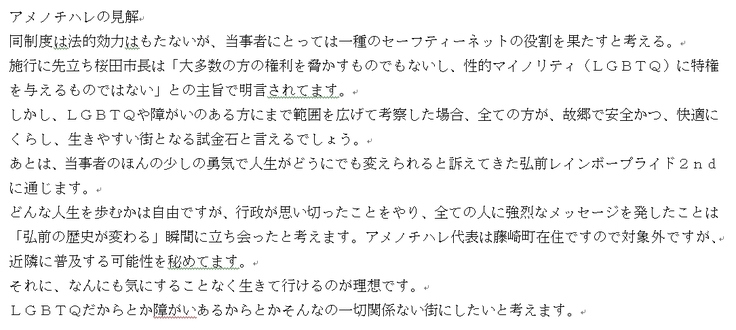 アメノチハレウィンターミーティングを明日に控え、弘前市パートナーシップ制度について我々の見解を発表したいと思います。
