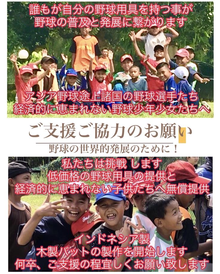 経済的に恵まれない環境で野球をしている子供たち(少年や少女)に木製バットを無料で提供をします!そして、アジア野球途上諸国の選手たちには低価格で木製バットを供給します!