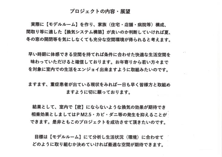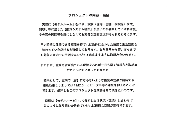 皆様の温かいご支援、拡散のご協力を宜しくお願い致します。 自己紹介 株式会社三良プランニング代表 新保正樹と申します。 建築業界に携わり50年の経験と知識をコロナ問題に活かせる 事が出来ないか、また、国の指導である【密】にならないように、 住宅、店舗、介護施設等々に最良・最適な換気システムを既存の 電機メーカーより選び、四季を通じて個々に対応できる【システム】 を建築家の立場から提案できると確信しております。