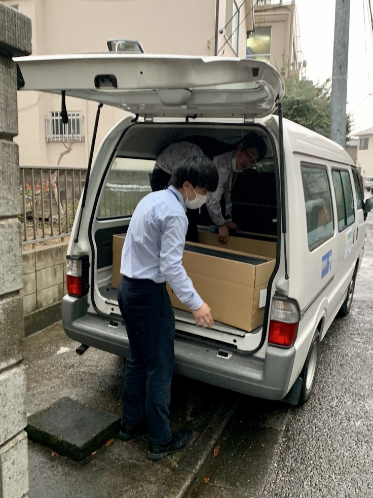 本日、既に完成している2500本のベルトを区へ引き渡しました。待ちに待ったベルトの旅立ちです。あいにく雨模様でしたが、区職員の方がバンを運転して受け取りにこられました。2500本はさすがに一度で運べず、3往復してお持ちいただきました。