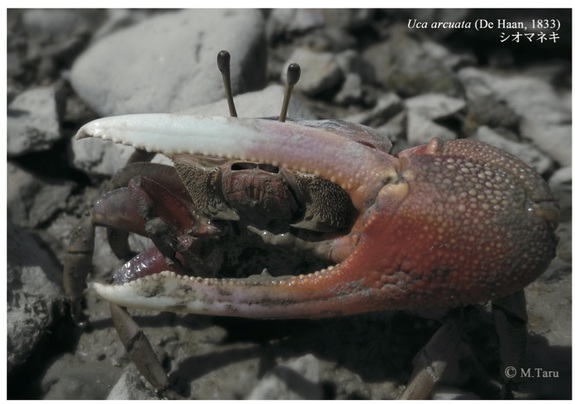 まず、シオマネキ。鋏の赤が鮮やかです。全国的に個体数が減り、絶滅危惧II類に指定されています(日本ベントス学会、2012)。