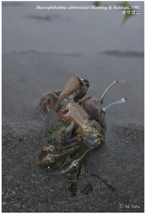 こちらはオサガニ。雄が雌を抱えています。これも全国的に個体数が減っている準絶滅危惧種です。九州沿岸では普通に見られるとのことですが。