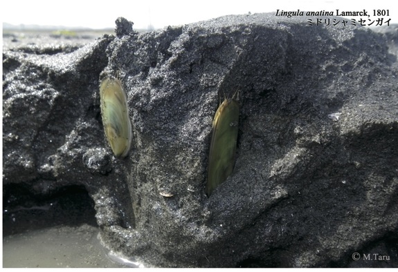 こちらはミドリシャミセンガイ。一見二枚貝に似て見えますが、二枚貝は軟体動物門に属するのに対し、ミドリシャミセンガイは腕足動物門に属し、大きく系統が異なる生物です。有明海では漁獲対象になるほど多い種ですが、他の海域では減少しており、やはり準絶滅危惧種です。