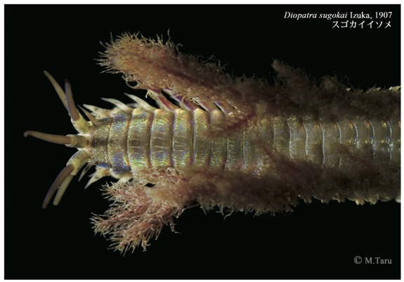 こちらはゴカイの仲間(多毛類)で、棲管を作るスゴカイイソメです。多毛類は動き回っていたり丸まってしまったりして、生時のきれいな写真がなかなか撮れません。多留さんは、掘り出した個体をきれいな海水に入れ、少しずつ麻酔をかけて動かなくなったところを撮影するそうです。身体の表面のクチクラ層が虹色に輝き、ふさふさした鰓の色も赤く鮮やかで、多毛類の中でも神秘的で美しい種類だと思うのですが、いかがでしょうか。