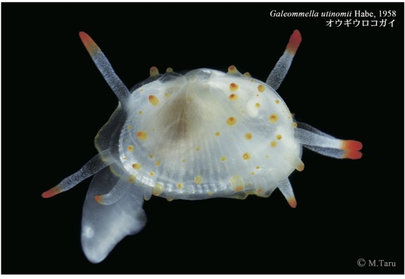 最後にオウギウロコガイ。殻長1 cmに満たない小さな二枚貝です。よく保全されたアマモ場周辺で見つかる希少な貝で、絶滅危惧IB類に指定されています。鮮やかなオレンジ色の突起をもつ白い外套膜が殻表面を覆っているのが特徴です。