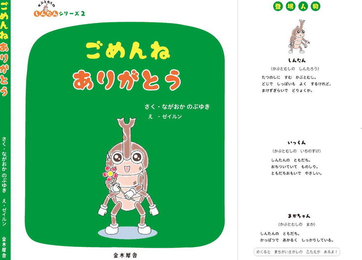 今回出版する絵本は、主人公の「かぶとむしのしんたろう」とお友達の かぶとむしのいちのすけくん・まかちゃん との 友情の話です。