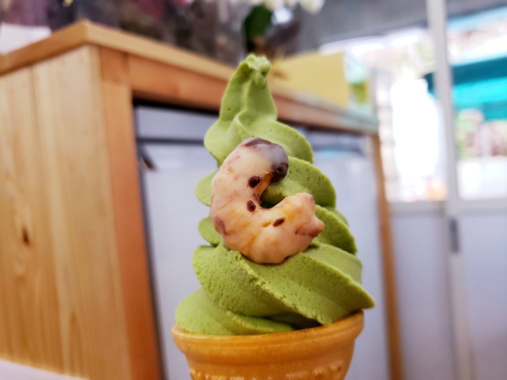 (昆虫館人気の幼虫アイスクリーム※ホワイトチョコをあしらったお菓子のトッピング)