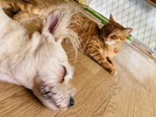 現在小梅の状態、様子としましては手術も成功して、順調に回復し、今は先住犬のわさびと走り回ったり、ごはんももりもりよく食べて、排便もスムーズで便の状態も良く、調子も機嫌も良さそうで元気に過ごせております。