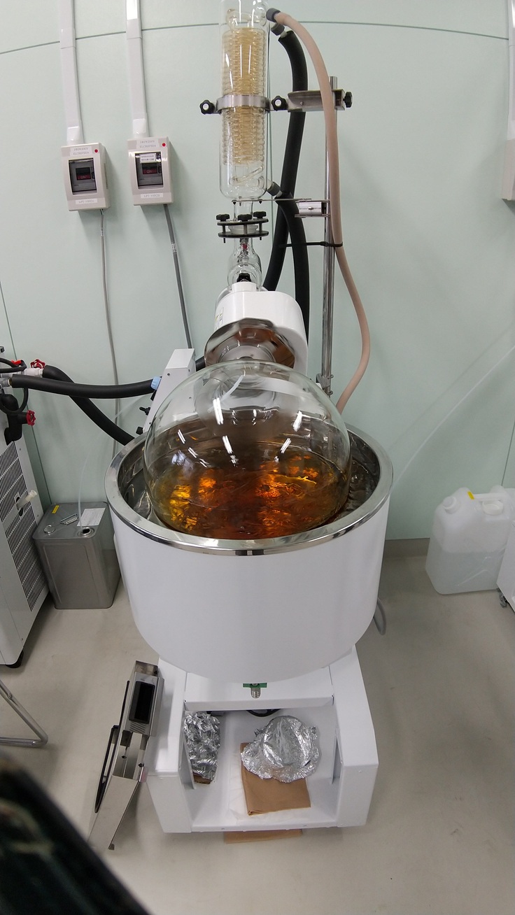 スーパービタミンEの製造中です。取り出したスーパービタミンEの写真(丸いガラスの中に入ったオレンジ色の液体)です。