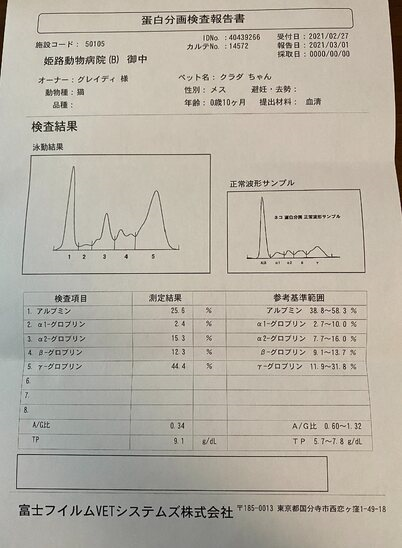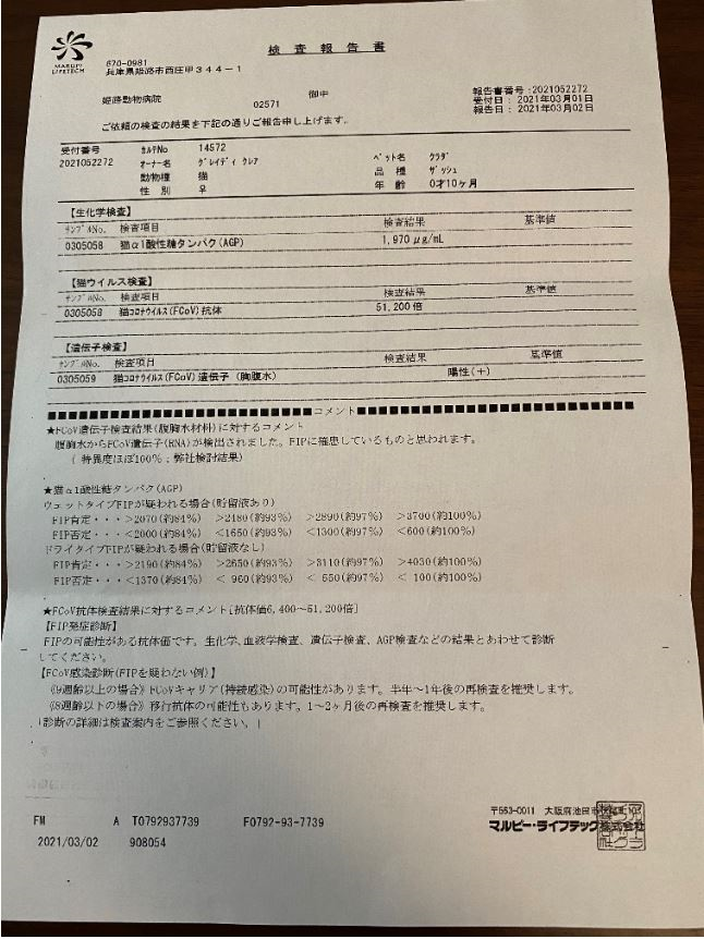 これで、FIP(猫伝染性腹膜炎)を疑いました。