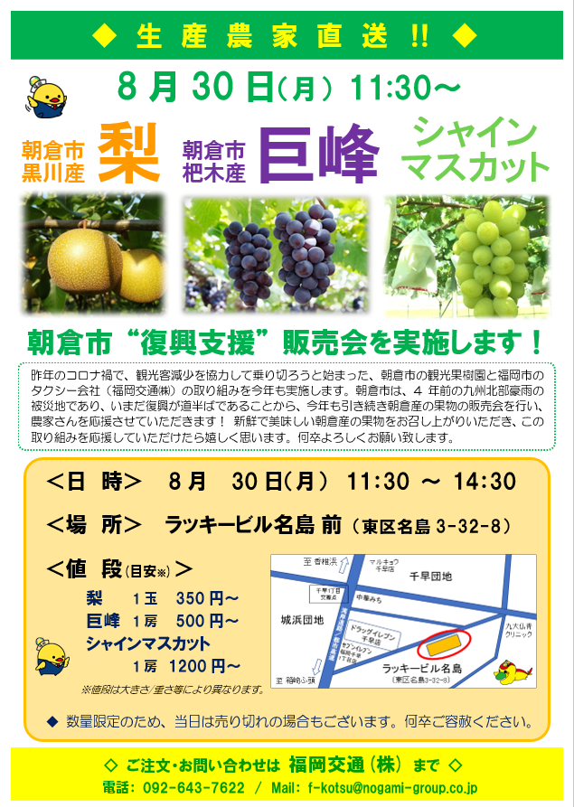 8/30は梨、巨峰、シャインマスカット、9/6は梨と残っていればシャインマスカット、9/14と20は梨のみの販売になる予定です。その後(9月末から10月初旬頃から)は、杷木志波産の柿や東峰村産の棚田米も加わる予定です。