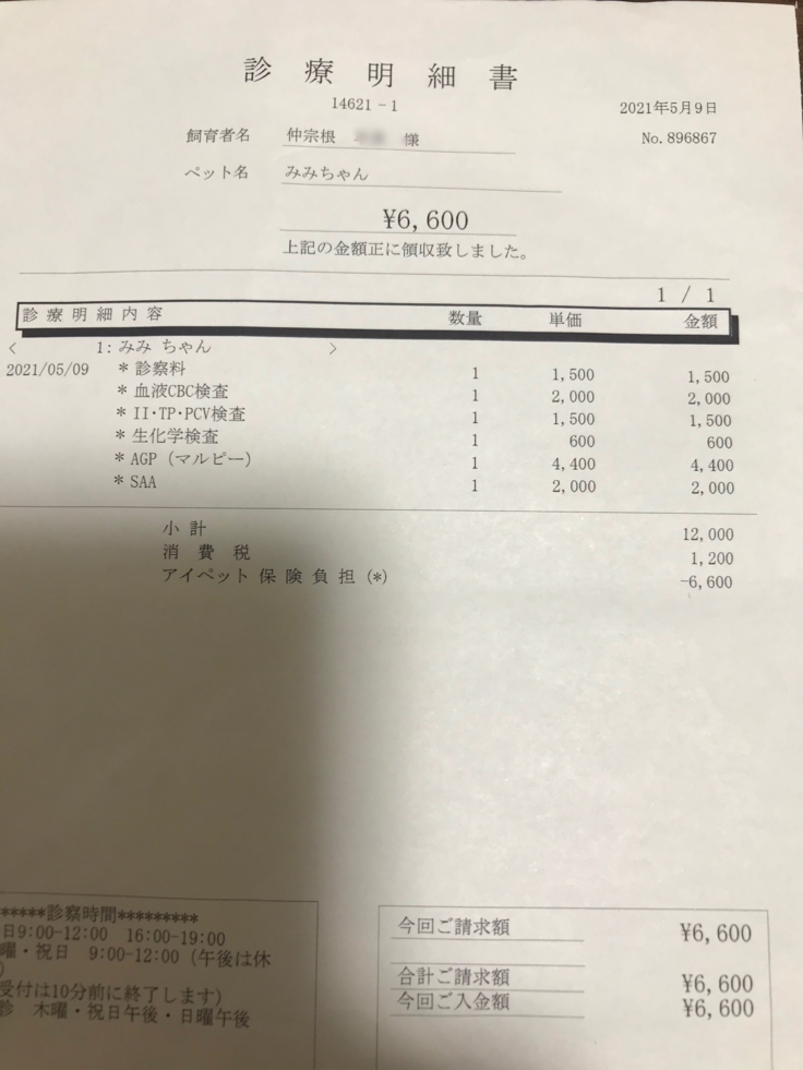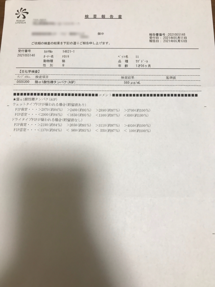 協力病院の先生に検査結果を見てもらったところ、AGPは炎症反応の数値で、FIP以外でも上がるとのことです。