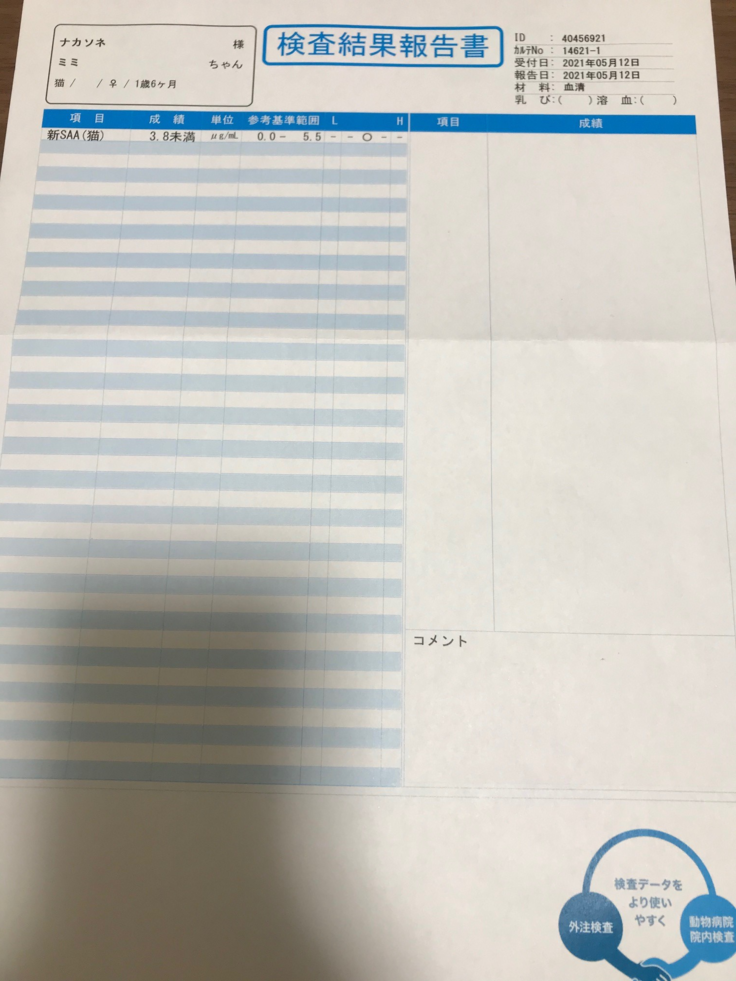 先日の血液検査の結果が届きましたのでご報告させていただきます。