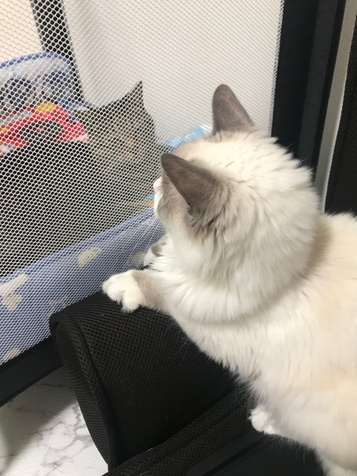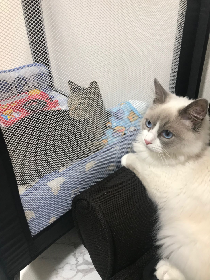 ベガはベビーサークルが最近お気に入りでよく入っているのですが高さがあるのでミミはなかなか入れなくて外から見つめているのですが離れ離れになったカップルのようで面白いです🤣💕
