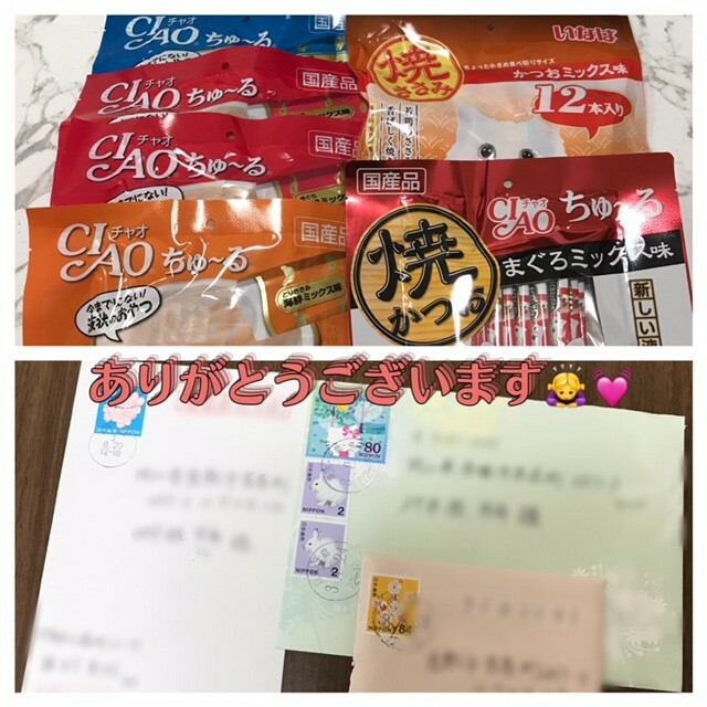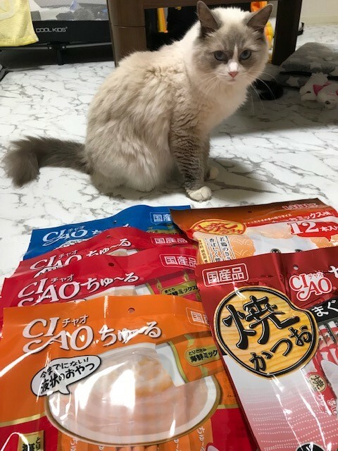 中を開けてみるとたくさんのチュール、焼きカツオなど送っていただきました(>_<)