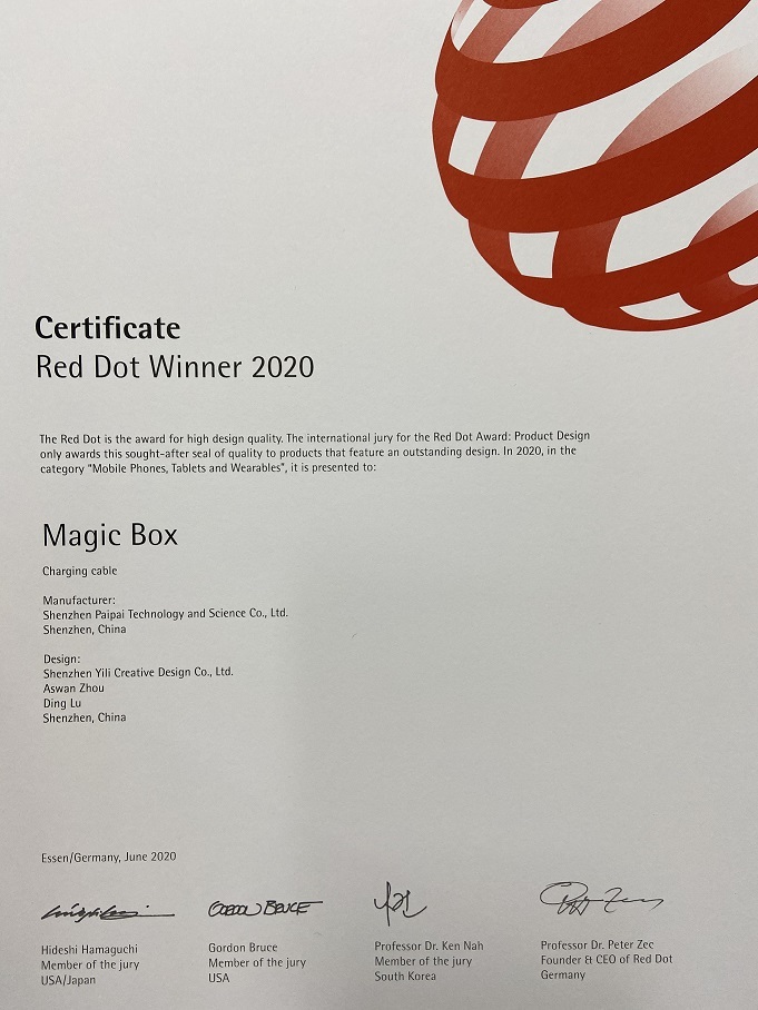 今度弊社が出したMAGIC BOXにはデザイン性及び実用性を両方重視して開発した商品であります。2020年ドイツでレッド・ドット・デザイン賞を受賞しました。僅か58gで急速充電ができ、さらに三つのケーブルでの同時充電が可能となっております。