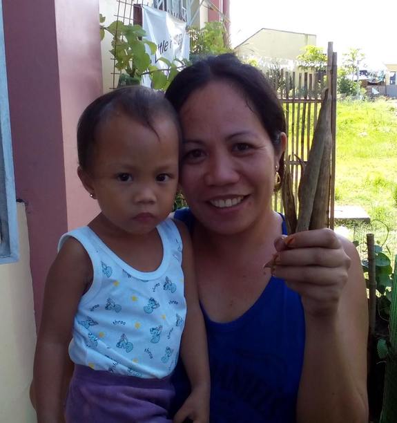 カマルフリーダの指導で家庭菜園をはじめたおかあさんです。子どもが健康に育つために必要な野菜が確保できました。健康な食事をおなかいっぱい食べられるようにしたいそうです。