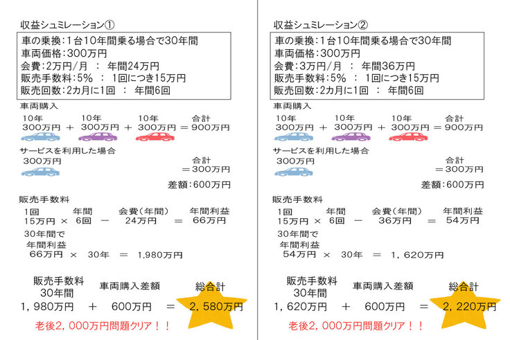 大前提としてサービスを亡くさないという事が一番ですが、会員様には基本的には同じ価値の車を乗り継いで頂くので一台の車両を長く乗るよりも車両価値が下がらない為プラス価値に転じます。また、車両自体も会員様の所有物になりますのでサービスが無くなったとしても車両が無くなることはありませんのでご安心下さい。