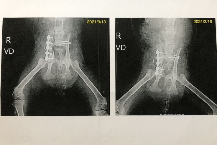 医療センターで改めて骨盤骨折(右腸骨骨折、左恥骨骨折)、左右仙腸関節脱臼と診断されました。後肢は全く動かせない状態で、骨折によって骨盤周辺の臓器を傷つけている可能性もあるため至急手術が必要とのことでした。手術をしても完全に歩けるようになる保証はないこと、合併症のリスク等の説明を受け、手術をお願いしました。