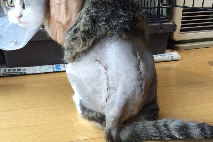 父が自宅の庭でうずくまっている猫ちゃんを発見しました。顔をじっと見つめ何かを訴えているようでした。元気がなく後肢のあたりを痛がるようだったので、すぐにかかりつけの動物病院に連れて行きました。病院に着くと血尿と発熱がありぐったりしており、おそらく交通事故による骨盤骨折だろうと診断されました。かなり大掛かりな手術が必要とのことで、整形外科手術のできる医療センターを紹介してもらいました。