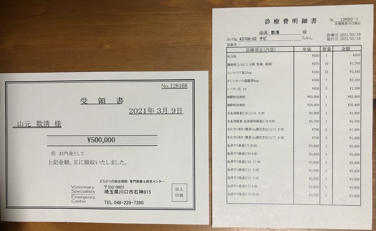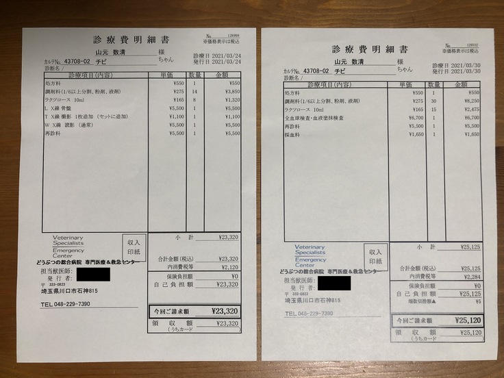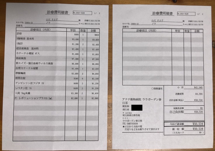 以下、これまでの診療費の明細です。猫ちゃんの名前はノラちゃんからチビちゃんに変わりました。また、明細書の宛名は両親(山元さよ子、山元数清)となっています。