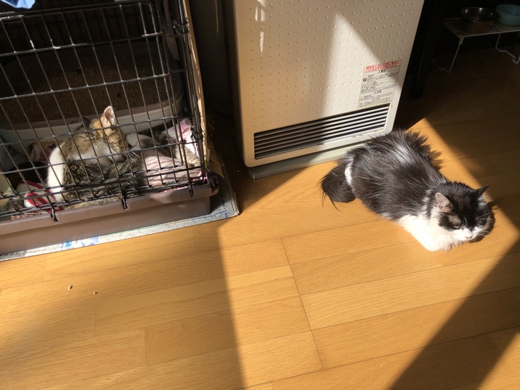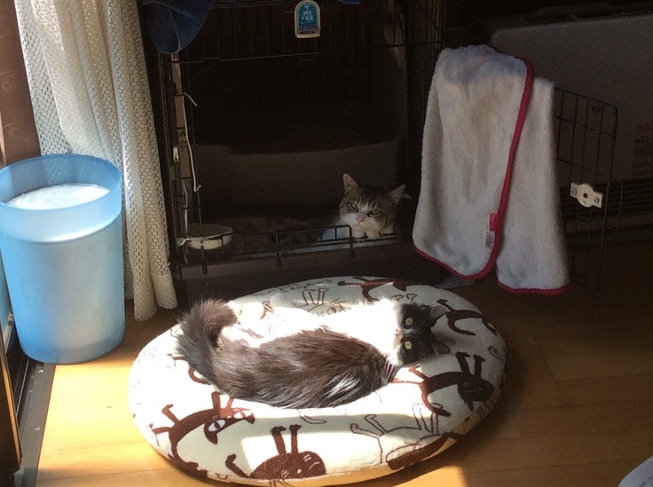また、先住猫との相性も心配していましたが、グー♀(ハチワレ)が優しく迎え入れてくれて安心しました。グーはシャイで臆病な子ですが、マルが来たその日からすぐにゲージへ寄っていき、優しくコミュニケーションをとろうとしてくれていました。ゲージの中のマルのことが気になって気になってしょうがなく、毎日ゲージのそばで日向ぼっこする姿が微笑ましかったです。