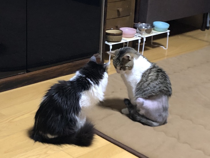 好奇心旺盛なマルはちょいちょいサビに近づこうとするのですが、可憐にスルーされています(たまにシャーといわれている)。もともとマイペースな子で誰に対してもそんな感じなので猫らしいといえばそうかもしれないです。