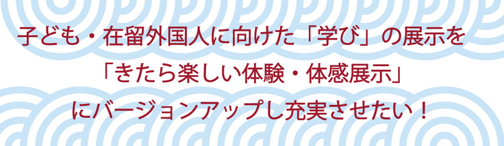 地元の小中学生から大人、そして在留外国人がより楽しく、体験的に学んでもらうことを実現するために、再現模型や立体展示物、デジタル展示、ハンズオン展示などを追加し、見る(2D)だけではなく体験(3D)をプラスして、より楽しく学べる展示が必要であると考えています。