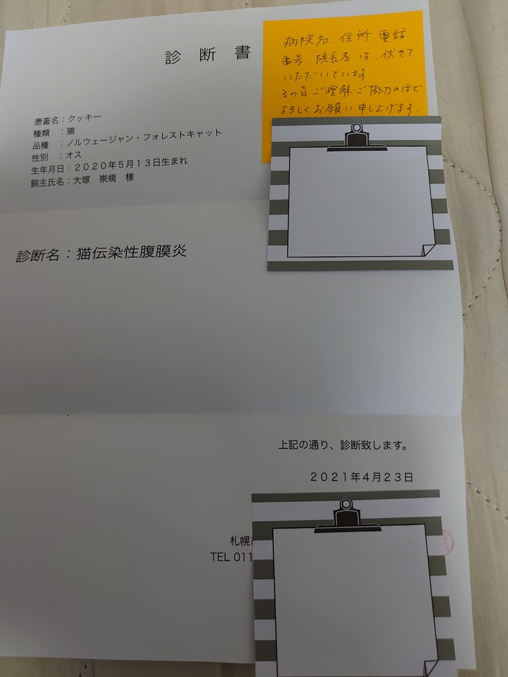 今月初めに愛猫の元気が無い、食欲不振が続き心配になり動物病院で受診した結果、致難病FIPに羅患してる事が判明、ネットで調べいる内に未公認の新薬こそが唯一の希望でありますが、未認可の医療薬品で高額である事を知りました。