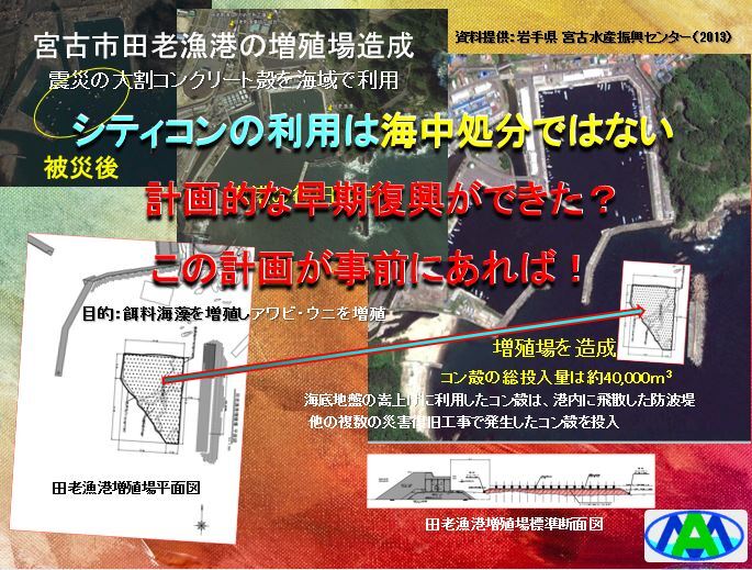 下図は東日本大震災後、岩手県田老漁港で増殖場造成にシティコンが活用された例です。