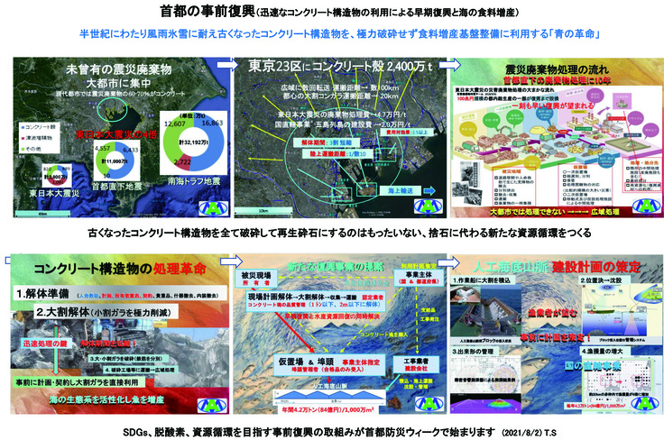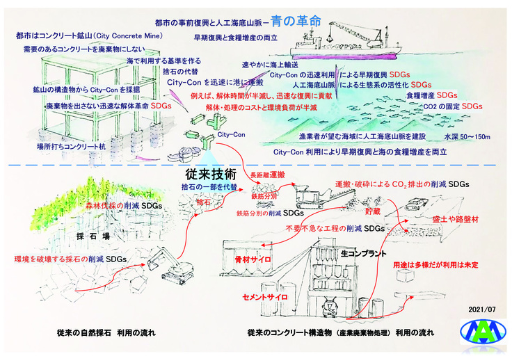 平時に、産業廃棄物となるコンクリート構造物を新たな基準でシティコンに解体し、これを人工海底山脈に利用する流れを、技術的、法制度的に確立する必要があります。