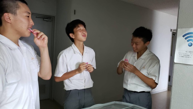(休憩中に氷を食べて、暑さをしのぐ生徒たち 広島朝鮮初中高級学校フェイスブックより)