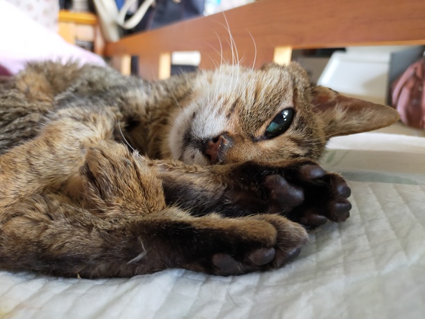 最近は写真みたいに後ろ足を抱えるような寝相が多いです笑