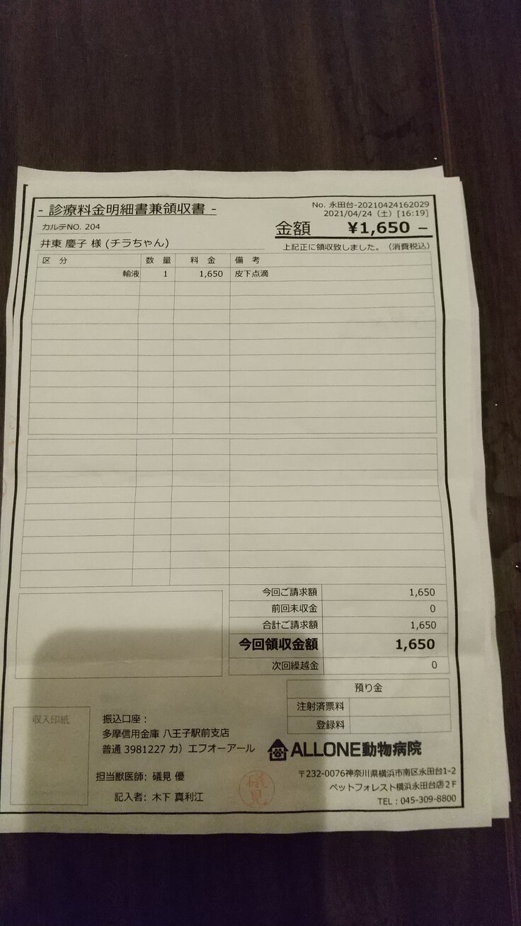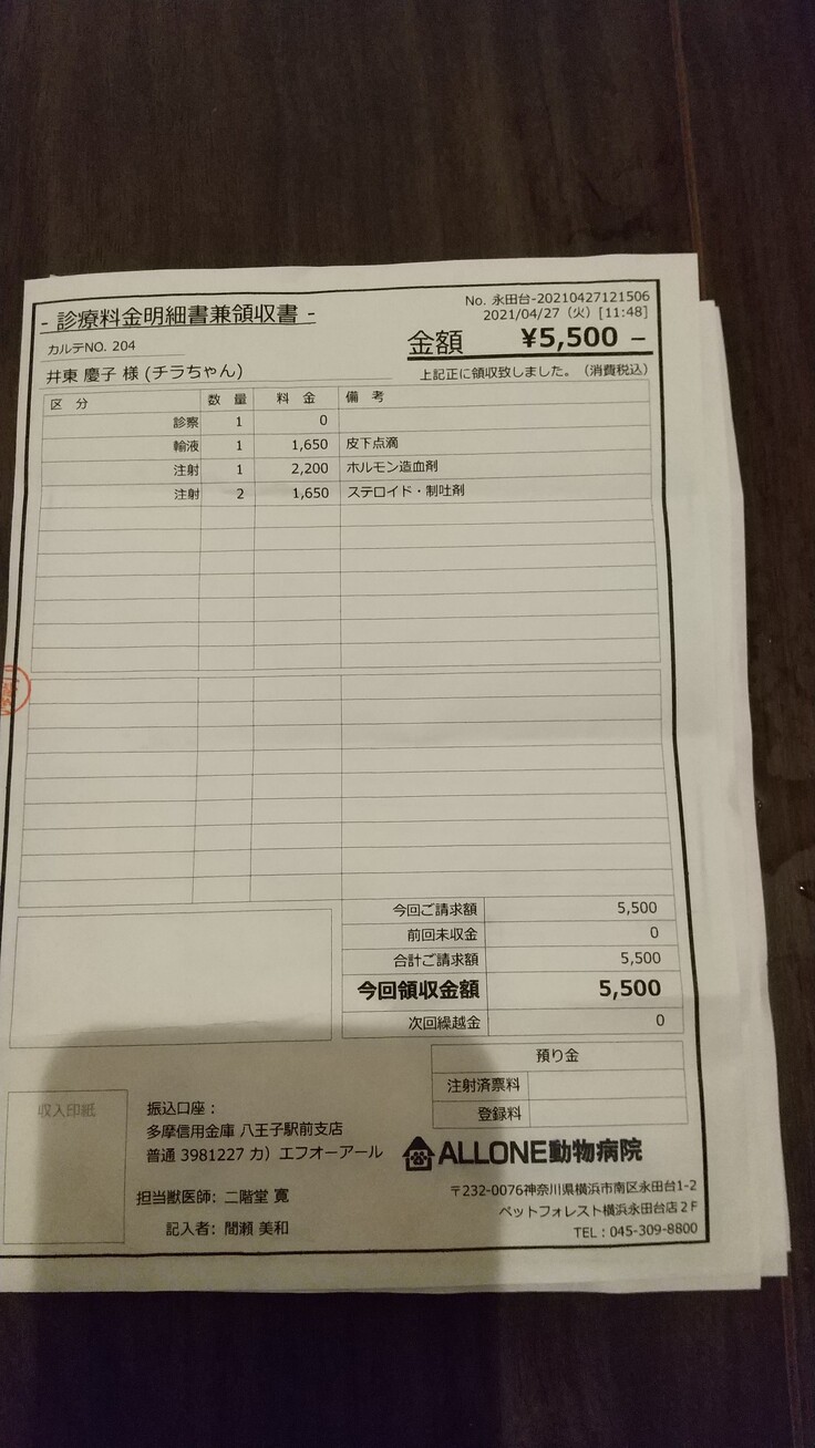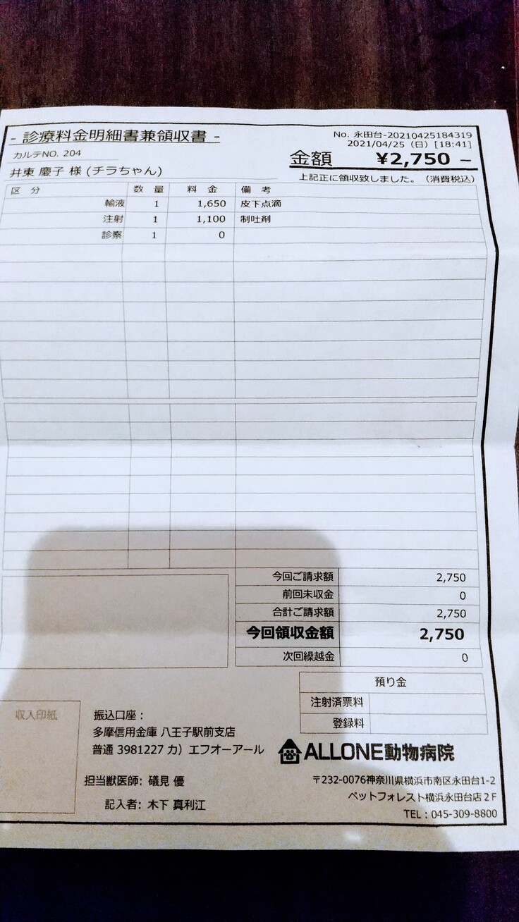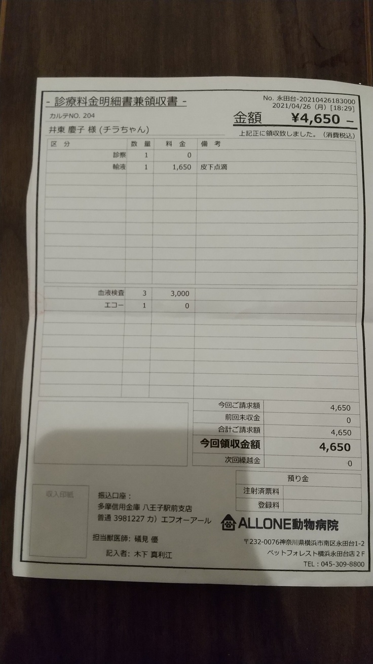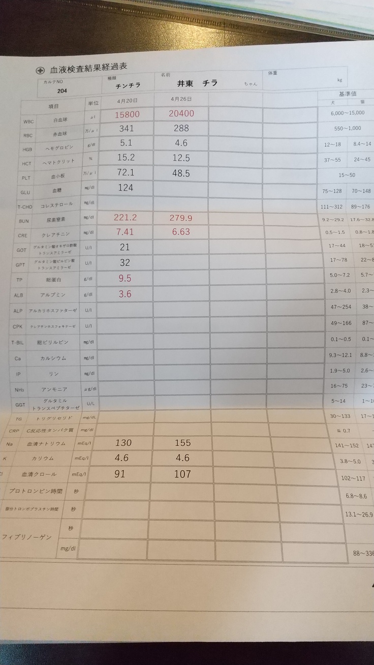 腎臓病のため、輸血や入院、静脈注射、皮下点滴、吐き気止め、血を作る注射