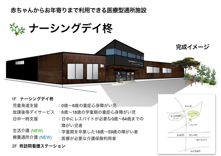 高齢者やガン末期の自宅で最期まで過ごしたいというご利用者様も、いつも訪問している看護師やリハビリスタッフがいる場所に「療養通所介護」も併せて開設することにしました。赤ちゃんから高齢者まですべての事業を1カ所にまとめ建設する計画をしています。