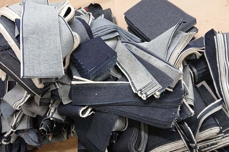 倉敷の特産であるデニムの残布と、