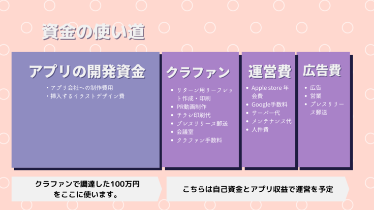 アプリの開発費以外は自己資金と運営で捻出できるように考えております。