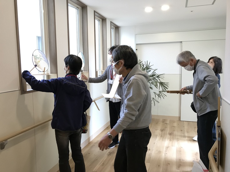 令和4年4月1日に「多機能型重度グループホームおうちだ」がオープンし、コミュニティスペースには大内田出身の坪井進氏の絵が飾られ、玄関ホールには利用者の方の絵が飾られています。また撫川うちわ保存会の方が、うちわを展示してくださっており、地域の伝統とアートが詰まった素敵な空間になっています。