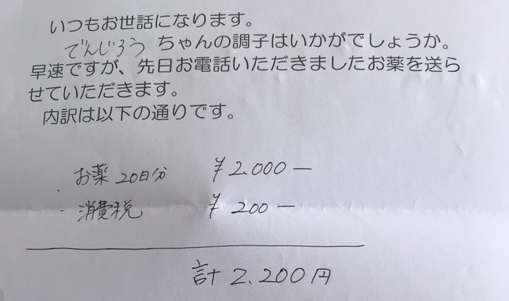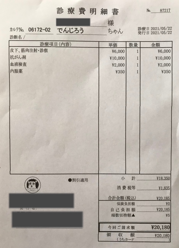 抗がん剤の他にも筋肉注射と血液検査とステロイド剤を処方していただいたので、予定より請求額が高くなりました。