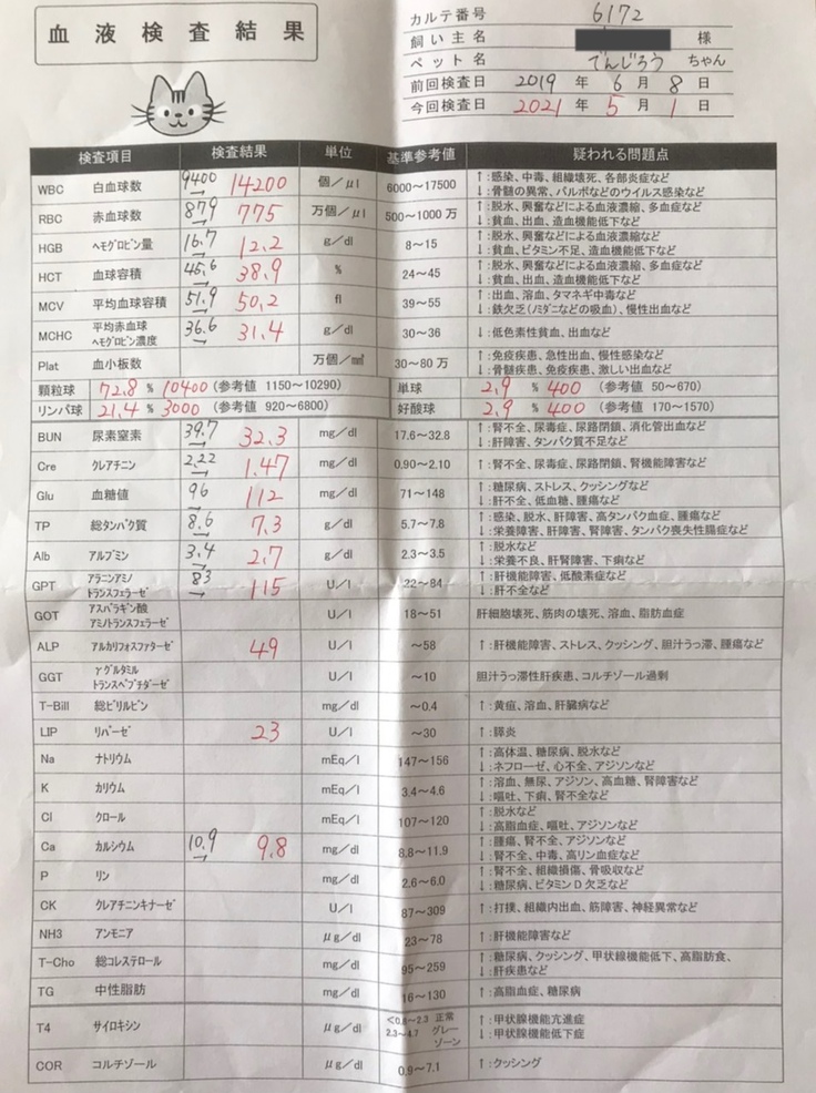 人間の年齢だと86歳です。高齢ですが、食欲旺盛で毛艶もとても良く、元気に遊んでるのに何でまた再発?と、悲しくて残念で苦しい気持ちでいっぱいです。